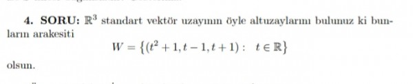 R 3 standart vektˆr uzay¨n¨n ˆyle altuzaylar¨n¨bulunuz ki bun- lar¨n arakesiti W = (t 2 + 1; t -1;t+1)
