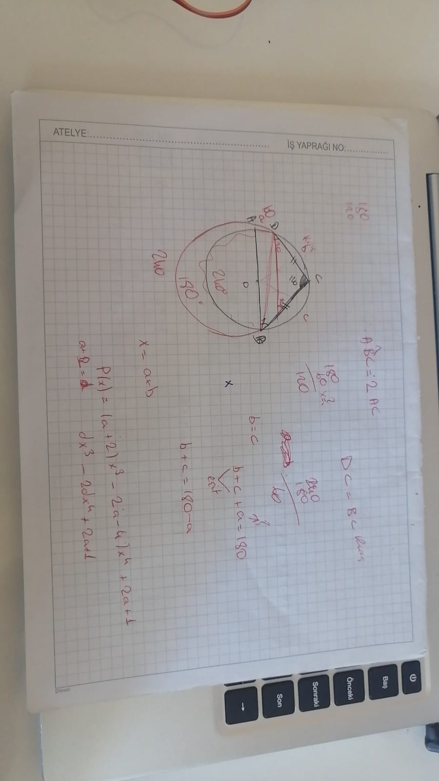 Alper hoca çözümünüzü anlamış. Ama doğrusu ben derli toplu, takibi mümkün ve anlamlandırılacak işlemler ve bir düzen göremedim. Kağıtta(üstelikte yan) sağa sola serpiştirilmiş, pek bir anlamı olmayan ve çoğu geometrik notasyonlara uymayan bir takım serpiştirmeler var.Sizin yaptıklarınıza göre takip etmek isteyen birisi, samanlıkta iğne aramalı. Matematiğin her şey den önce bir düzen olduğu unutulmamalıdır.