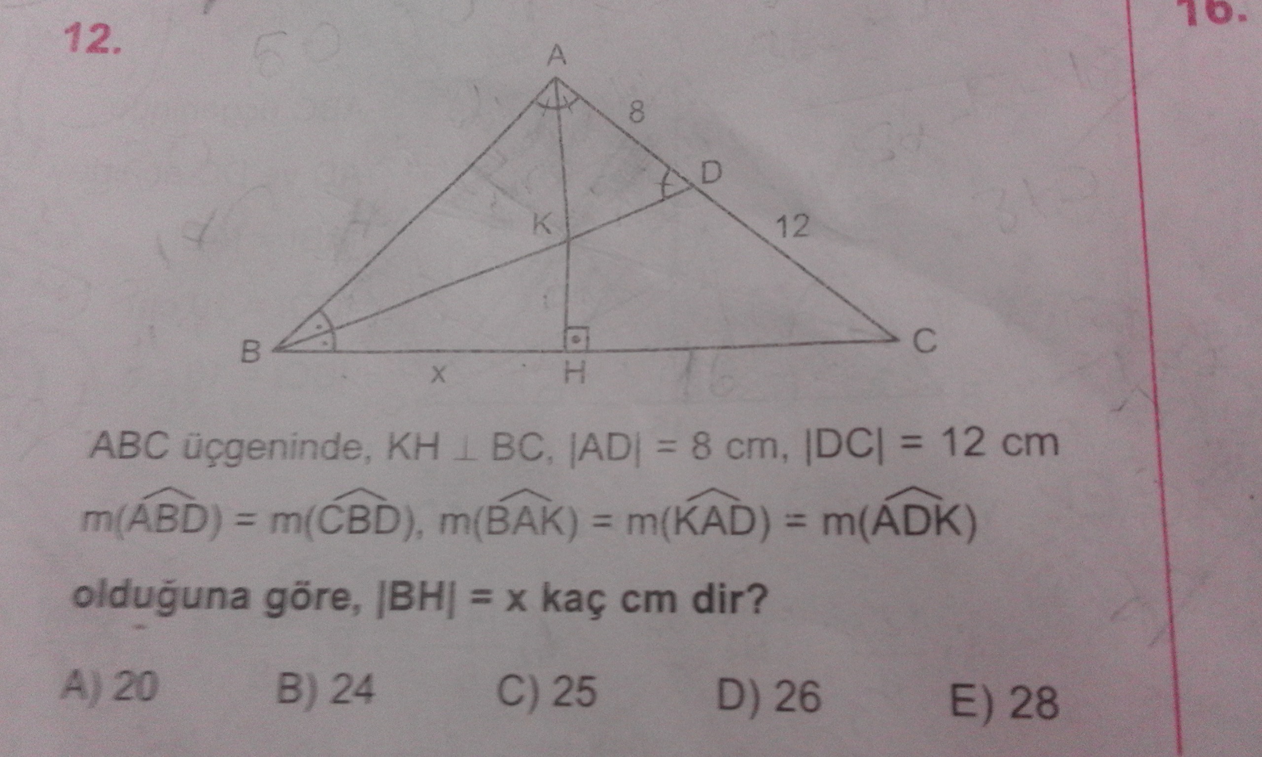 $|TC|=|HC|=16,\quad |AP|=|AT|=4, \quad |BP|=|BH|=x,$ olacaktır. Şimdi $ABC$ üçgeninde $[BD]$ iç açıortayı için iç açıortay teoremi uygulanırsa, $\frac{x+4}{x+16}=\frac{8}{12}\longrightarrow x=20$ cm bulunur.