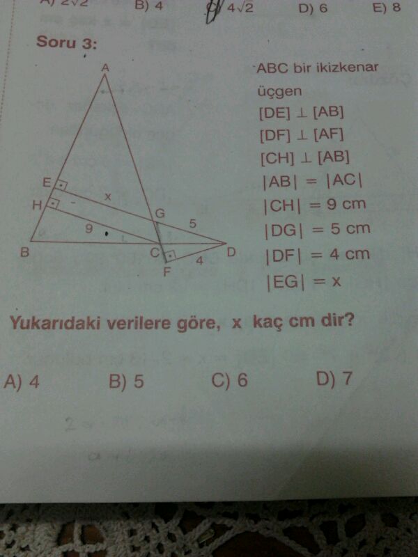 İkizkenar bir üçgenin tabanı üzerinde (ama tabanın köşeleri arasında olmamak üzere) alınan bir noktadan eşit kenarlara indirilen dikmelerin farkı,taban köşelerinden birisinden indirilen dikme boyuna eşittir. Buna göre $5+x-4=9\Rightarrow x=8$ olur.