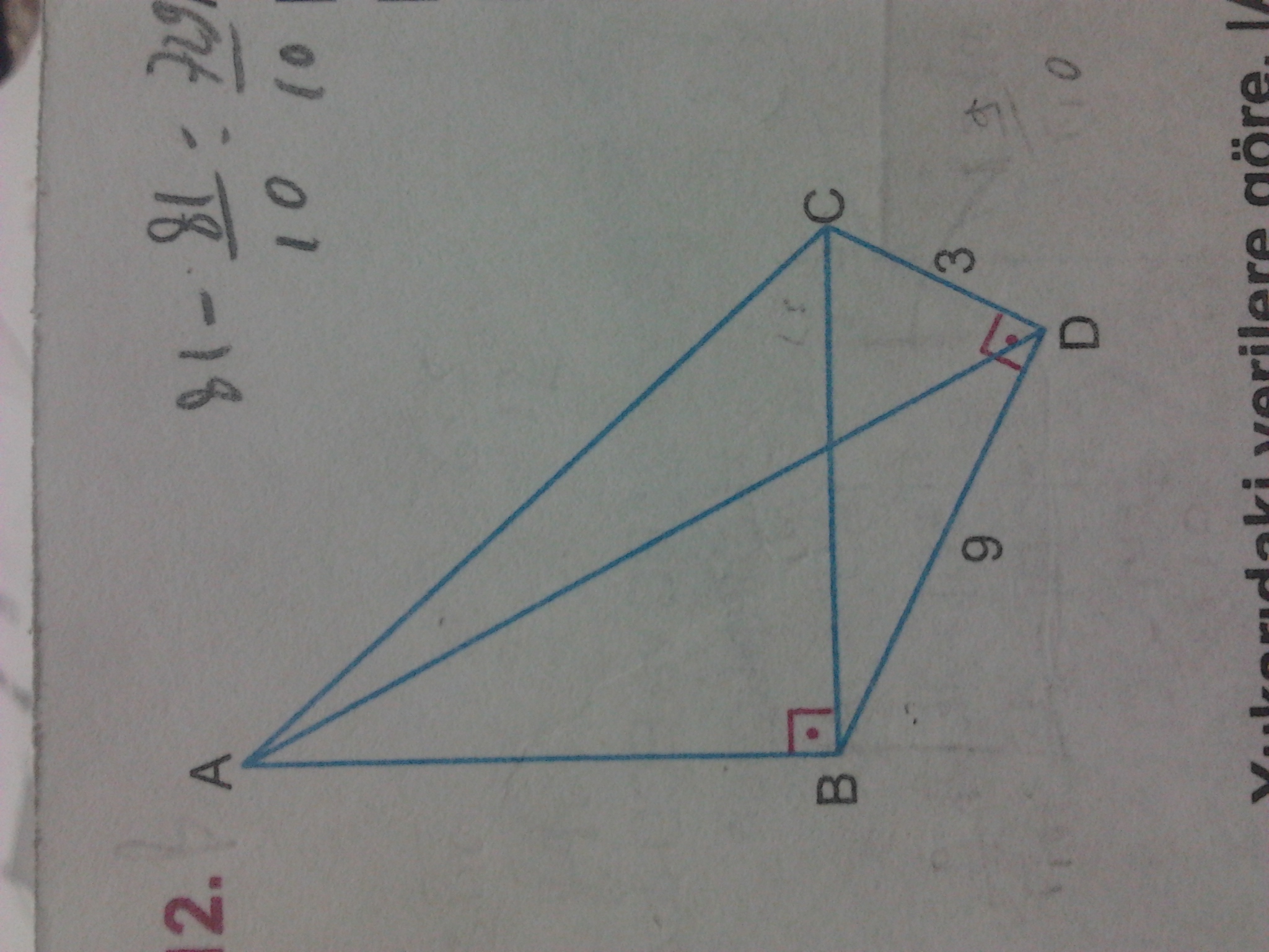 $[DH]\bot[BC]$ ve $[DK]\bot[AB$ çizelim.$|BC|=AB=3\sqrt{10}$ ve $3\sqrt{10}.|DH|=3.9\Rightarrow |DH|=\frac{9}{\sqrt{10}}$ ve $81=|BH|.3\sqrt{10}\Rightarrow |BH|=|DK|=\frac{27}{\sqrt{10}}$ olur. $ADK$ dik üçgeninde pisagor teoreminden:$|AD|^2=(3\sqrt{10}+\frac{9}{\sqrt{10}})^2+(\frac{27}{\sqrt{10}})^2$ den $|AD|=15$ olur.
