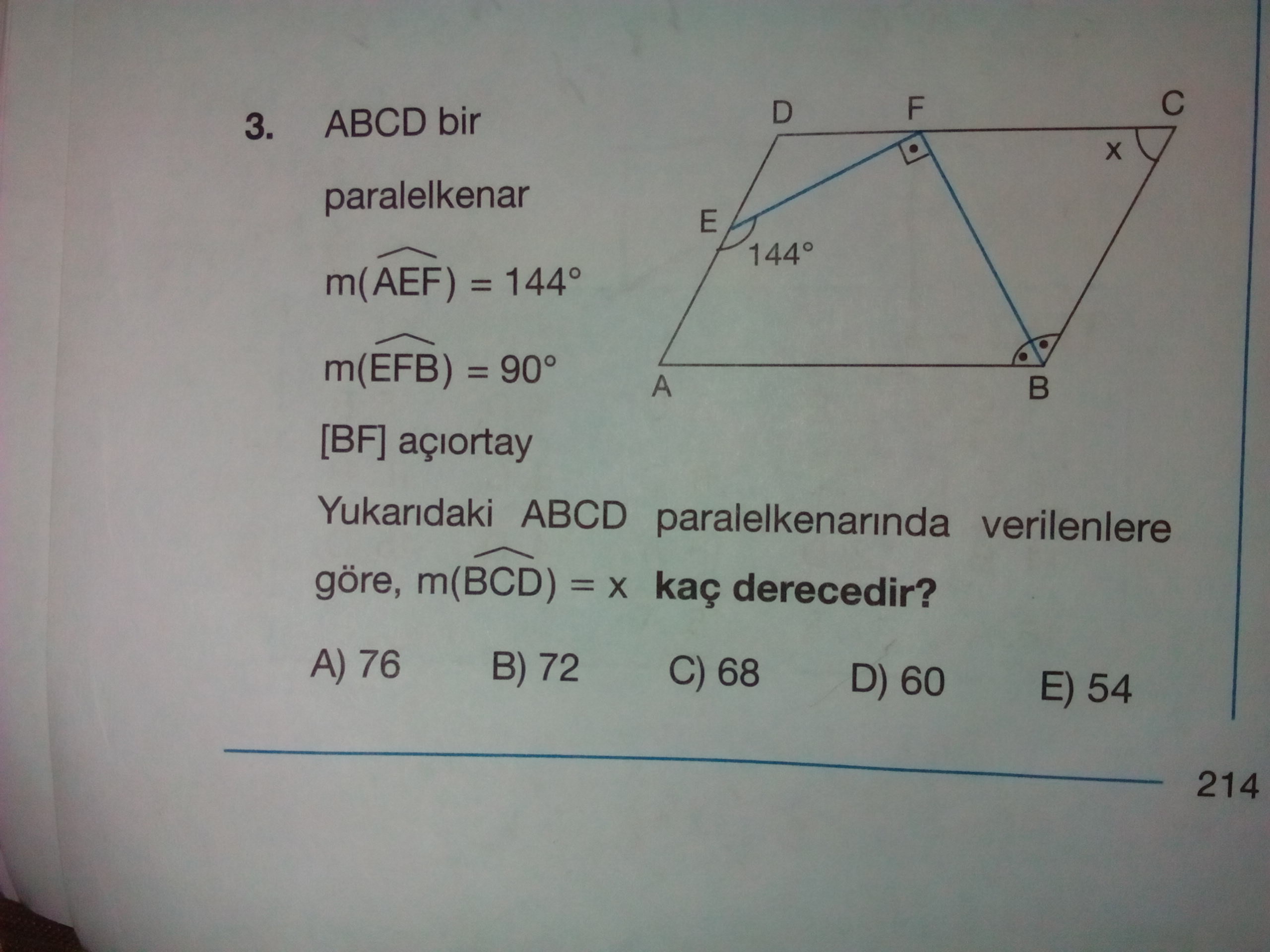Paralelkenarda komşu açı ölçüleri toplamı $180^0$ olduğundan $m(B)+m(C)=180$ dir. Eğer m(B)=2\alpha ise $2\alpha+x=180\Rightarrow \alpha+x/2=90$ olur. $[FE\cap [BA=\{T\}$ olsun. $BFT$ dik üçgeninde $m(BTF)=x/2$ olup, $144=180-x+x/2\Rightarrow x=72^0$ olarak bulunur.